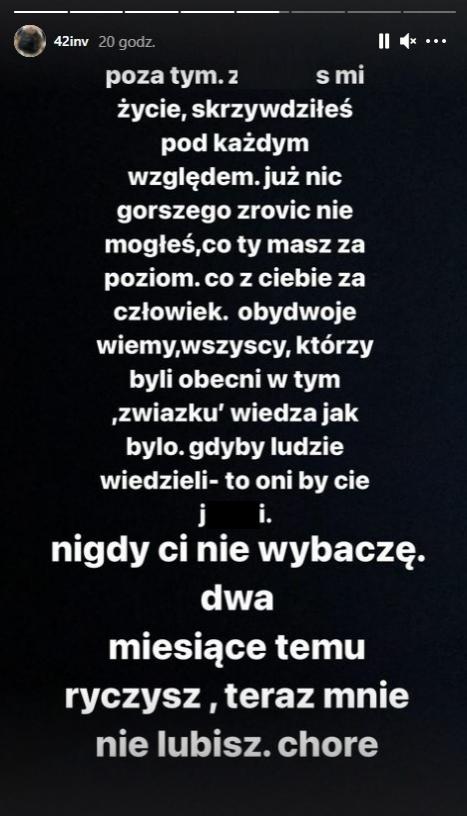 „- Zjebałeś mi życie. Skrzywdziłeś pod każdym względem. Już nic gorszego zrobić nie mogłeś. Co ty masz za poziom? Co z ciebie za człowiek? Obydwoje wiemy i wszyscy, którzy b yli obecni w tym „związku”, jak było. Gdyby ludzie wiedzieli, to oni by cię jebali. Nigdy ci nie wybaczę. Dwa miesiące temu ryczysz, a teraz mnie nie lubisz. Chore” napiała na InstaStories.