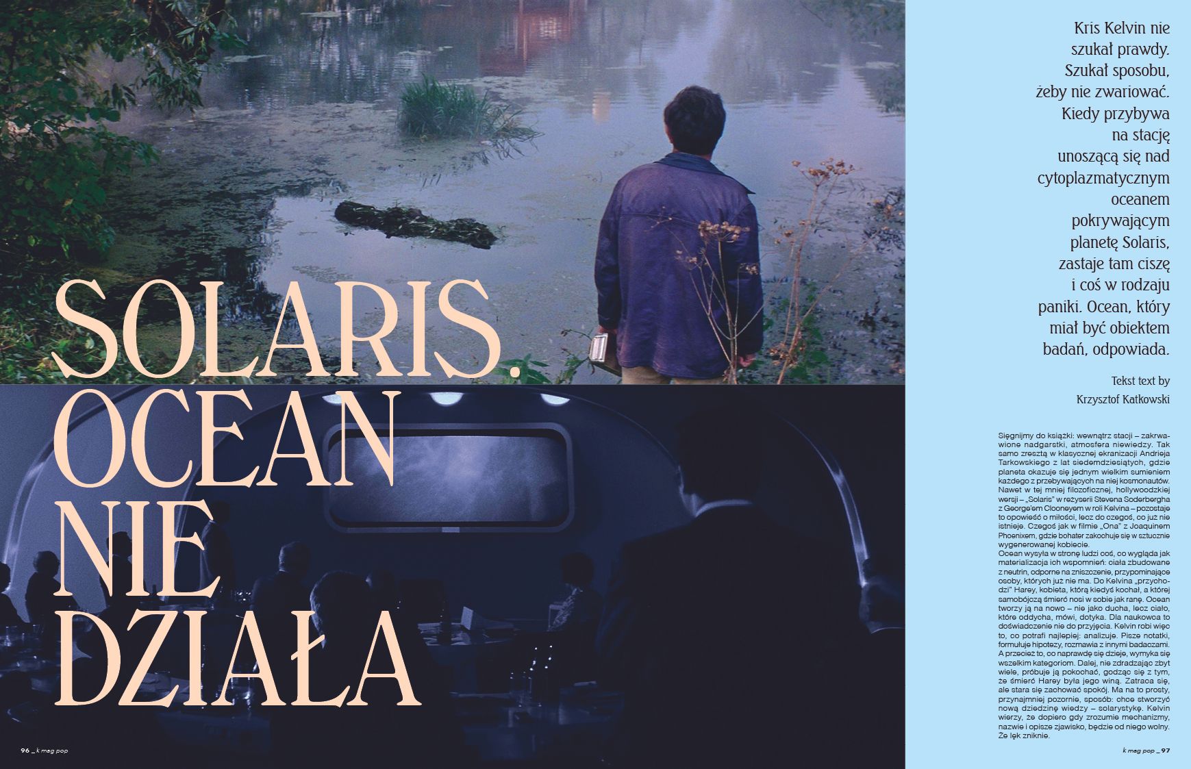 W postać Krisa Kelvina z „Solaris” wcielił się wybitny polski śpiewak, kontratenor i tancerz Jakub Józef Orliński, robiąc to z wielkim oddaniem i zaangażowaniem. W obiektywie Miko Marczuka, laureata nagrody Moskit K MAG-a, odtworzył sceny rodem z filmowych adaptacji kultowej książki. Sama rozmowa z Jakubem stanowi świetne wprowadzeniem w klimat, jaki chcieliśmy osiągnąć w tym temacie. Rozwinięciem jest na pozór nieoczywisty przegląd wybranych przez naszą autorkę Paulinę Wotzką młodych, ciekawych postaci, dla których pasja może być priorytetem w życiu. Wszystko wokół odkryć, technologii, nauki i wspomnianego przekraczania granic. O samym zaś pisarzu i nieco głębiej o „Solaris” pisze nasz nowy autor Krzysztof Katkowski, stawiając tezę, że pragnienie zrozumienia to u Lema forma obronna.