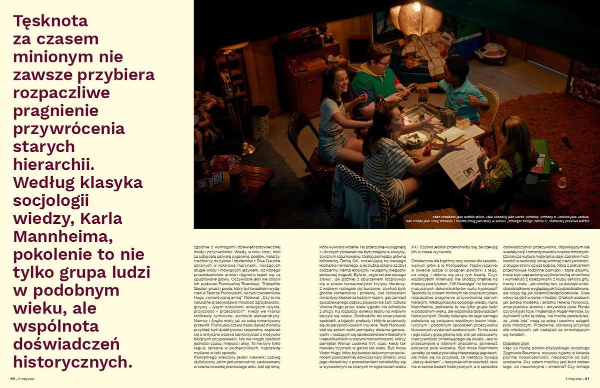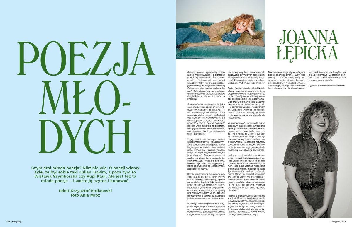 W bieżącym K MAG-u zainspirowani nieco renesansem tegoż dzieła na TikTok’u i z okazji czterdziestej rocznicy jego powstania stworzyliśmy naszą współczesną wariację na temat. Przed wami wydanie o łączeniu różnych światów, niezależnie od wieku, zainteresowań, subkultur, orientacji, pochodzenia... Znakomicie w klimacie „The Breakfast Club” odnalazła się nasza okładkowa gwiazda, piosenkarka Sara James, przed obiektywem laureata zeszłorocznego Moskita K MAG-a, Jakuba Jezierskiego. Tuż obok święcący międzynarodowe triumfy reżyser – Janek Komasa, który dla nas wszedł totalnie w filmową rolę rozrysowaną przez Miko Marczuka (Moskit K MAG-a 2024). Oczywiście Sara i Janek przedstawili nam swoje światy w obszernych rozmowach. Do tego prezentujemy subiektywny wybór młodych poetów i ich światopogląd, a nasz etatowy ulubieniec pióra – Kasper Cecha Czerwiński, rozpisuje się jak po raz pierwszy w historii ludzkości pogodzić wspólną egzystencję sześciu pokoleń na raz. Co ciekawe, ma bardzo pozytywne wnioski i to jak zawsze gruntownie przeglądające się w przeszłości. Analizuje to, co nas dzieli i łączy, mocno trzymając się naszego tematu przewodniego. W tym numerze także rozmowy z rodzimymi eksportowymi kostiumografkami – Malgorztą Turżańską i Gosią Karpiuk, a także kolejnymi laureatami naszych Moskitów – piosenkarką Ajlą i artystą malarzem Jędrzejem Bieńko… Wszystko dosmaczone oryginalnymi interpretacjami przewodniego tematu w sesjach zdjęciowych nowych odkryć redakcji.