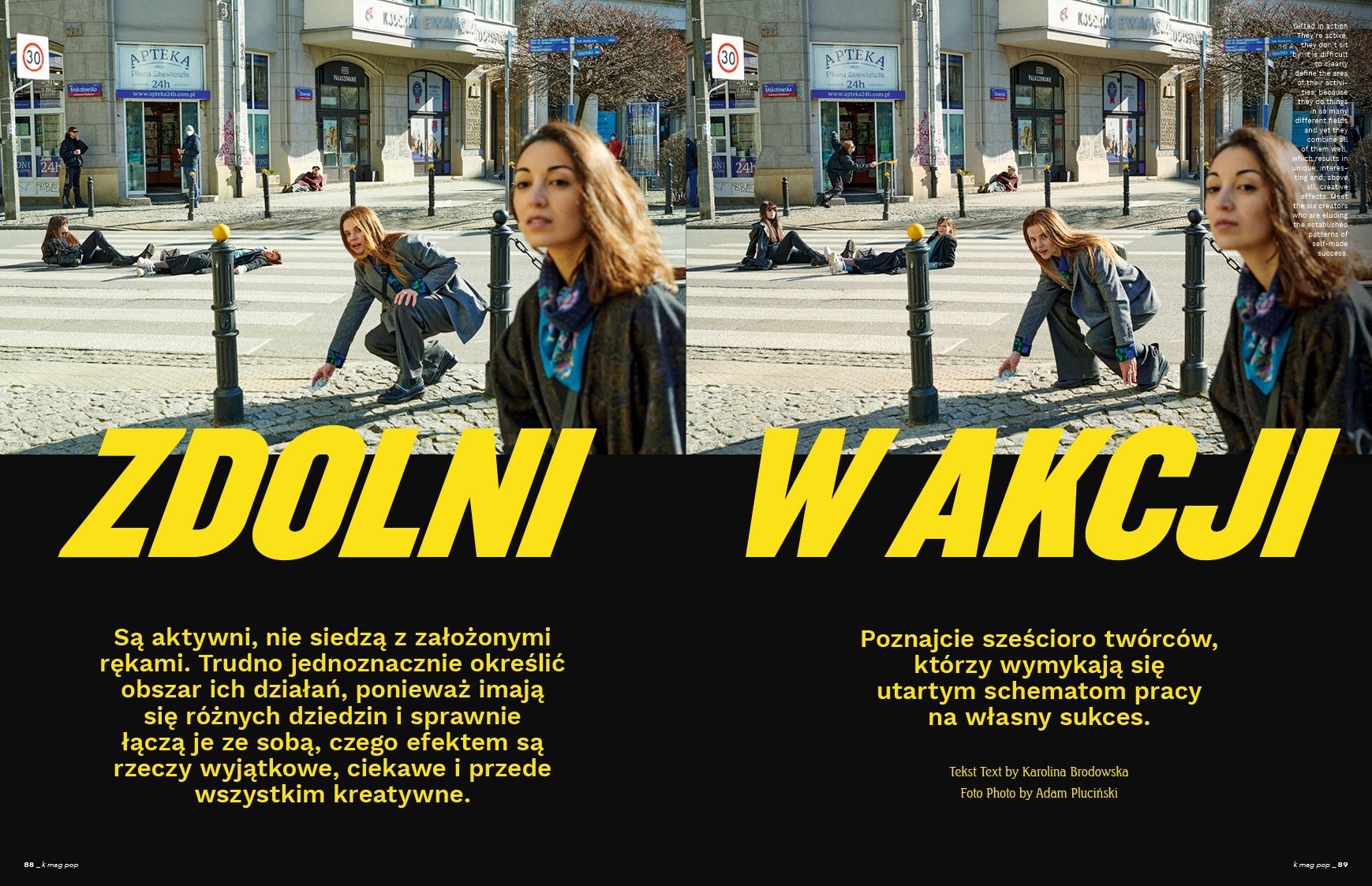 Na naszą okładkową bohaterkę wybraliśmy od lat podziwianą w K MAG-u, prawdziwą „action-girl”, Monikę Brodkę. Nie dość, że świetnie śpiewa, to jeszcze pisze, komponuje, produkuje, reżyseruje czy fotografuje. A przy okazji inspiruje tysiące ludzi obserwujących jej dokonania. Brodka u nas w szczerym wywiadzie i sesji autorstwa Kamila Kotarby ilustrującej zaplecze powstawania kina akcji na tak zwanym „green screenie”. Zaś w roli istnego przeciwnika Bonda obsadziliśmy znakomitego aktora (w wolniejszych chwilach również wokalistę) – Arkadiusza Jakubika. Na wywiad i sesję w naszej siedzibie przyszedł w „płonących” spodniach z planu kultowego „Kleru”. Tę szpiegowską aurę jak z serii o agencie 007 dopełnia rozmowa z podróżującym dookoła świata duetem Globstory. Dla nich najodleglejsze rejony, plenery, ludzie i kolory to sposób na życie i zarabianie.