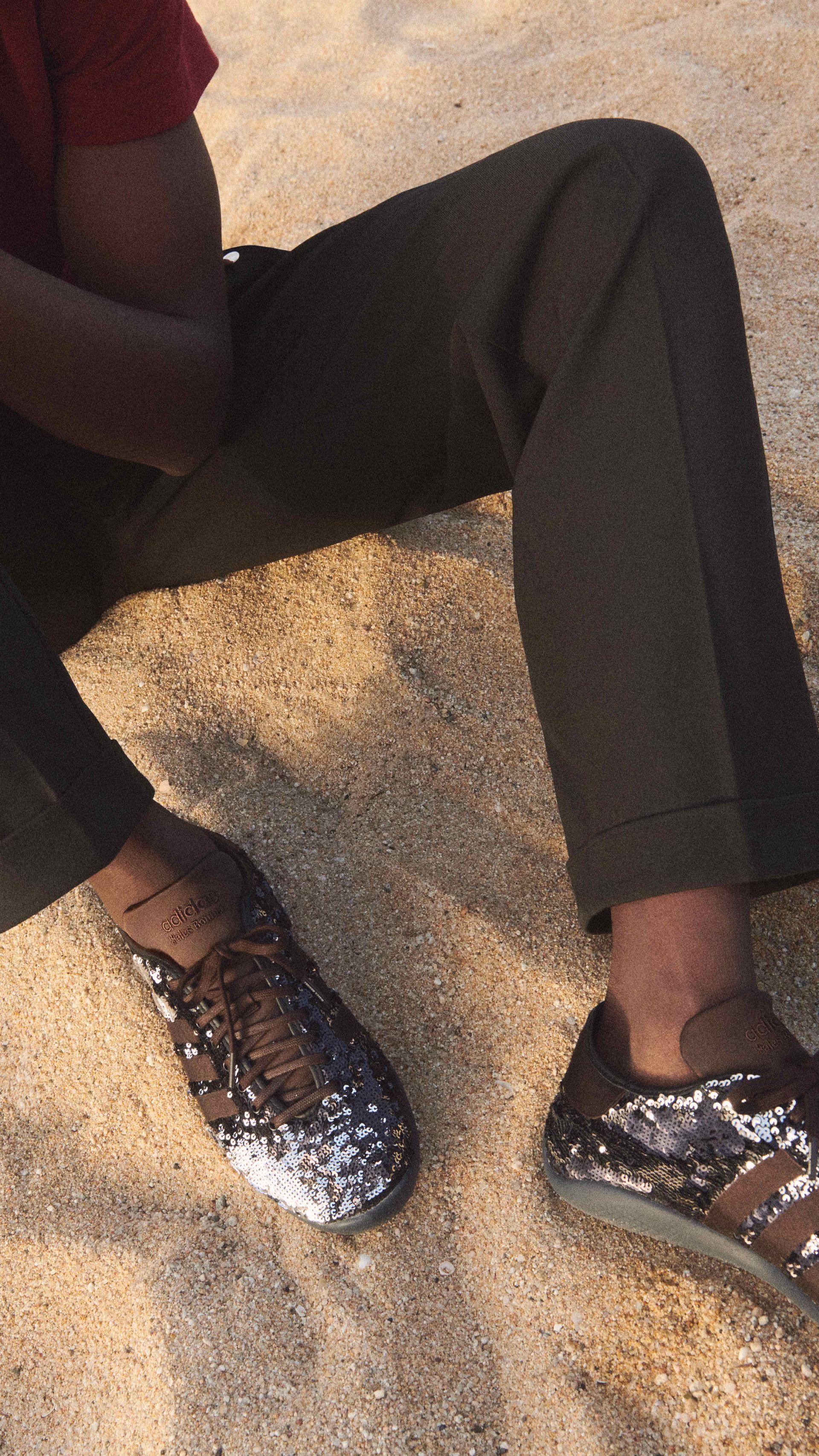 Wśród obuwia pojawia się zupełnie nowa sylwetka oraz dwie reinterpretacje archiwalnych klasyków adidas. Model WB Karintha to coś nowego – po raz pierwszy mamy do czynienia z butem, który należy do świata adidas, lecz został w pełni zaprojektowany przez Wales Bonner. Niski profil podeszwy z kontrastowym wzorem bieżnika wchodzącym na boki buta tworzy tło dla cholewki w stylu T-toe: raz ozdobionej cekinami z satynowymi, brązowymi wykończeniami, innym razem wykonanej z miękkiego zamszu w odcieniu toffi z subtelnymi trzema paskami.