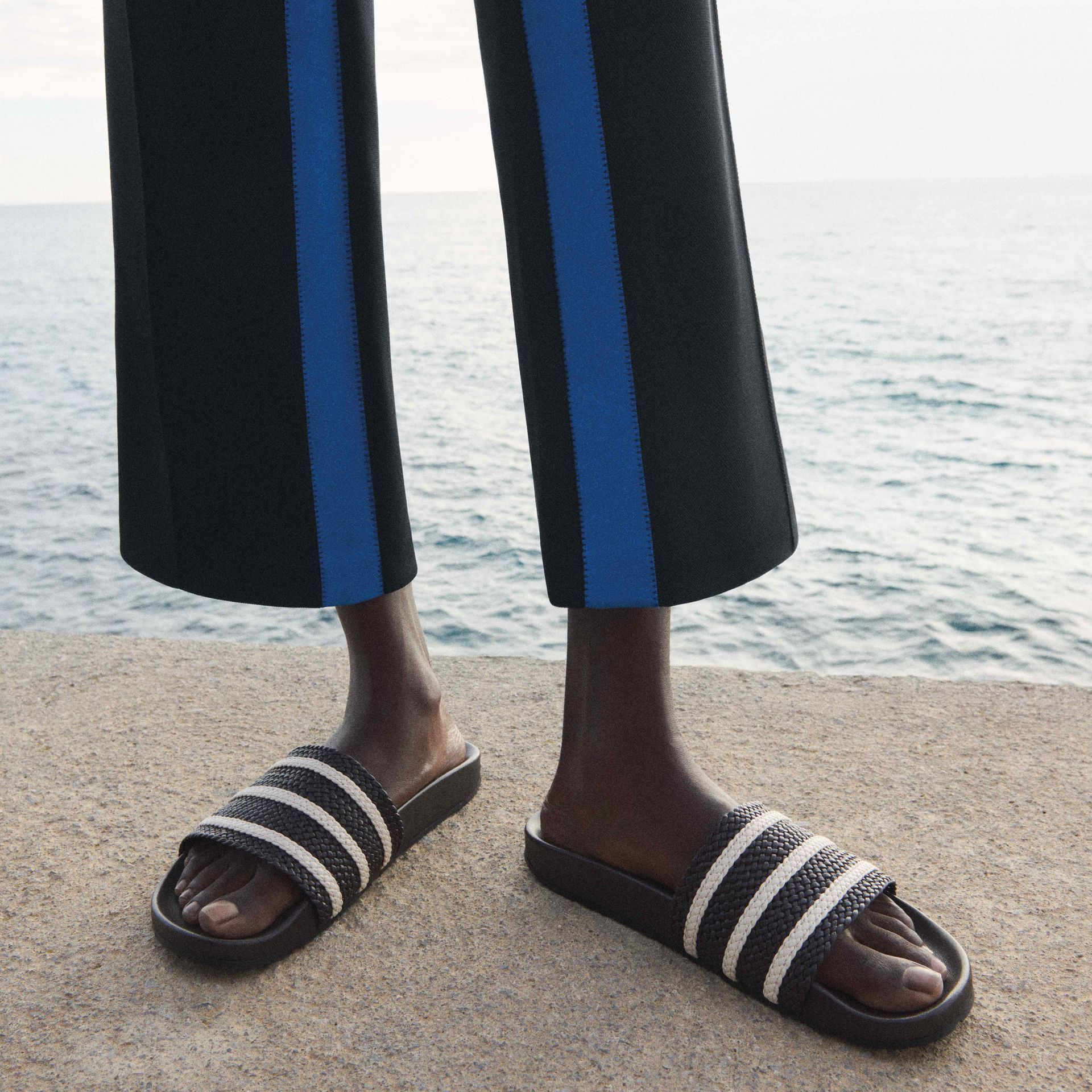 Na koniec – zgodnie ze wspomnianym klimatem wybrzeża – kultowe klapki adidas Adilette, zaprojektowane z użyciem skórzanej wkładki i ręcznie tkanych w Brazylii skórzanych pasków.