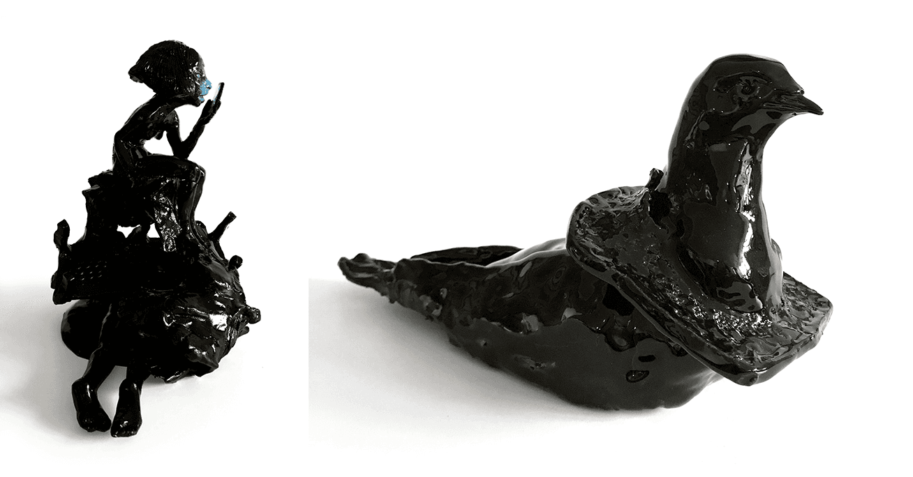 Po lewej: Agata Kus, Syrenka, ceramika, 2019; po prawej: Agata Kus, Boss, ceramika szkliwiona, 2019