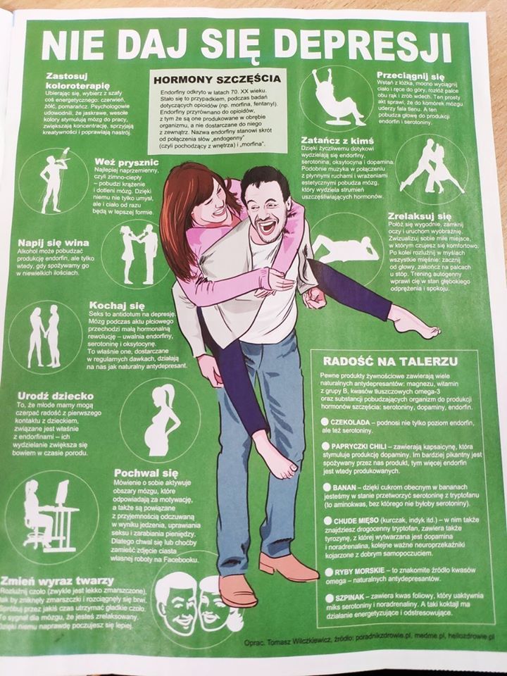 Jakie jeszcze rady znalazły się w poradniku "Angory"? Weź prysznic, zastosuj koloroterapię, napij się wina, kochaj się, urodź dziecko, pochwal się, przeciągnij się, zatańcz z kimś, zrelaksuj się. Umieszczono także dwie tabelki dotyczące hormonów szczęścia oraz produktów, które warto zjeść na poprawę humoru.
