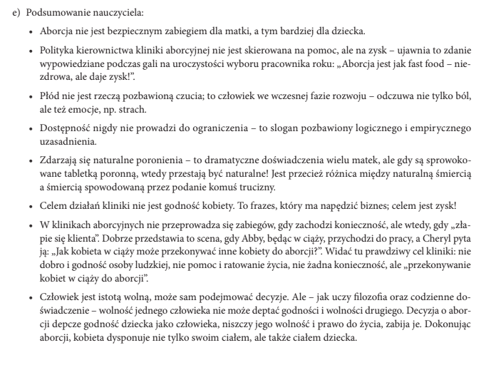 Jednym z moralnych dylematów zaprezentowanych w filmie jest scena, w której lekarz pracujący w klinice aborcyjnej zostaje zamordowany. W scenariuszu lekcji zamieszczono polecenie, by nauczyciel zapytał uczniów: „czy zabójstwo lekarza dokonującego aborcji jest skuteczną formą niszczenia zła?” – na które odpowiedzieć sobie mają sami uczniowie. Ale to wydaje się najmniejszym problemem, gdy weźmie się pod uwagę resztę scenariusza lekcji. A wygląda on następująco: