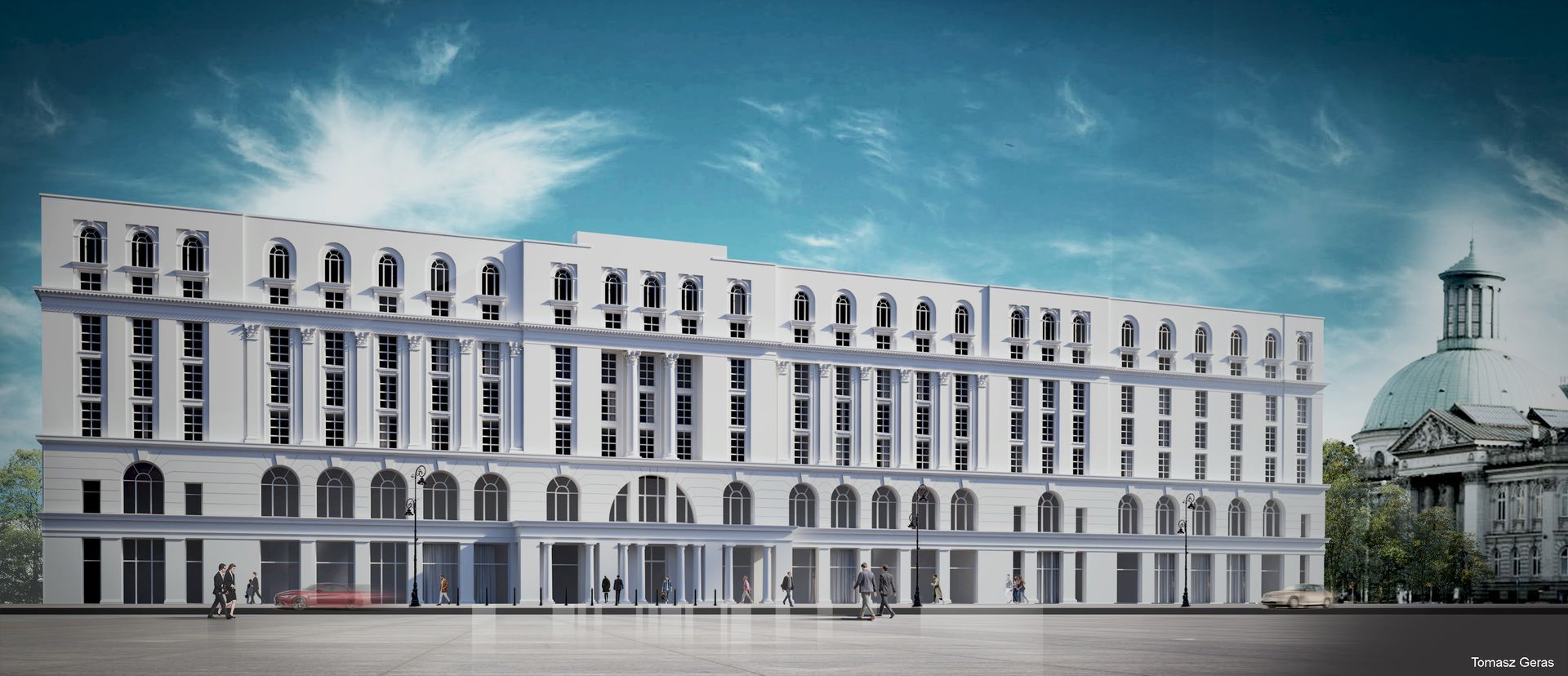 Tomasz Geras urodził się i pracuje w Warszawie, gdzie ukończył Wydział Architektury na Politechnice. Ostatnio zyskał rozgłos dzięki wizualizacjom, a których stołeczne budynki przedstawione są w stylu nowo klasycznym. Z Tomaszem rozmawiamy o specyfice neoklasycyzmu i o tym, dlaczego według niego ludzi ciągnie do jasnych, prostych budowli.
