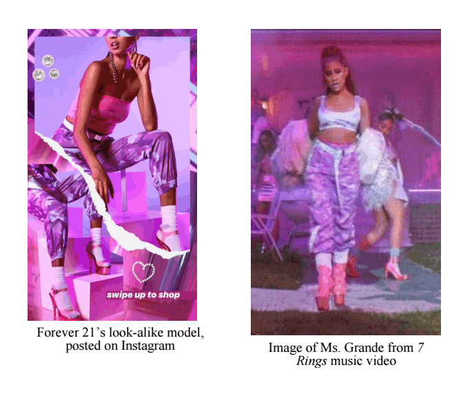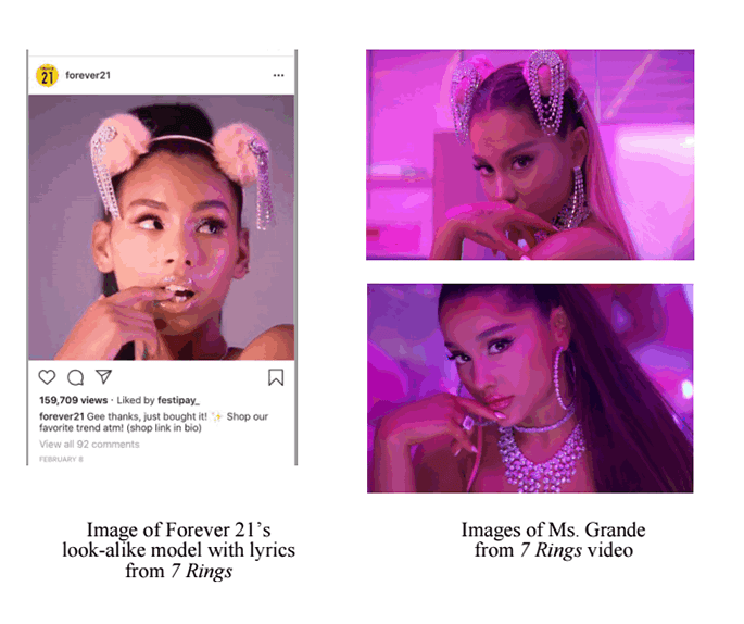 Ariana Grande pozwała młodzieżową markę Forever 21 za bezprawne użycie jej wizerunku z teledysku "7 rings" w kampanii odzieżowej na początku roku. Jak twierdzi Grande, na zdjęciach opublikowanych przez sieciówkę znajduje się modelka łudząco do podobna do gwiazdy, a fotografiom towarzyszą cytaty z jej utworu, na co ani piosenkarka ani jej management nie wyrazili zgody. W ramach zadośćuczynienia artystka żąda 10 milionów dolarów.