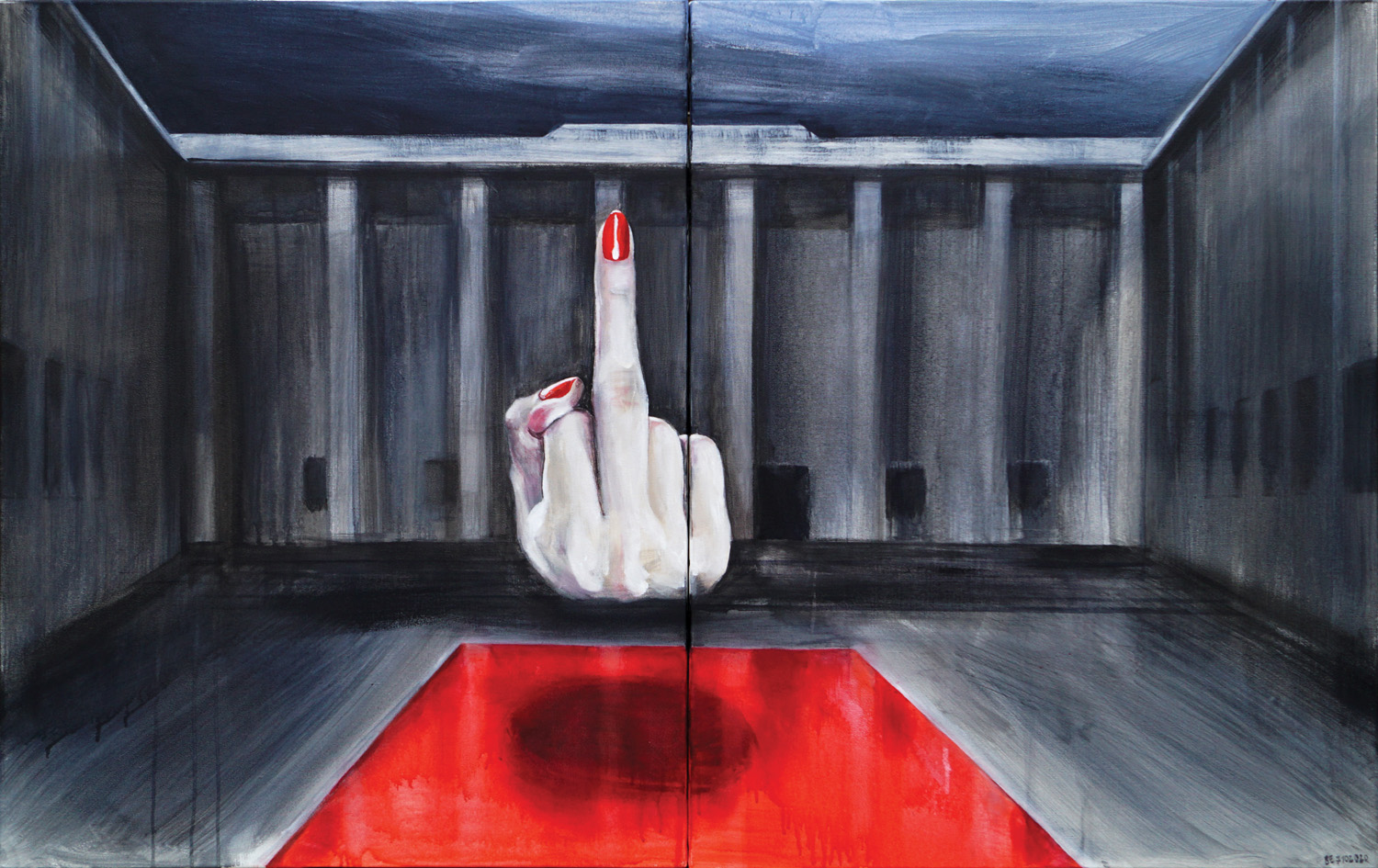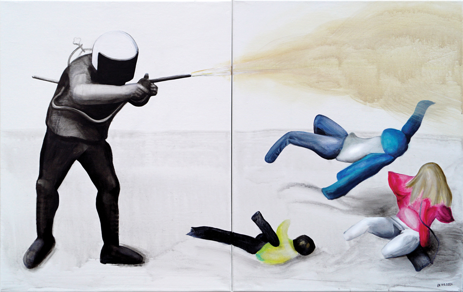 Nie tylko. W skład serii „2020” wchodzą też obrazy poruszające problemy społeczne, dyskryminacyjne, które były widoczne w różnych miejscach na świecie. Strajki #BlackLivesMatter, naruszanie praw mniejszości seksualnych. Obraz „#wypierdalać / Fuck off”, który w czytelny sposób odnosi się do protestów kobiet w Polsce. Czas największych strajków kobiet przechorowałam – miałam wtedy Covid – ale ta sytuacja była dla mnie jako kobiety i artystki bardzo ważna. W malignie choroby czułam tę gigantyczną energię wygenerowaną podczas protestów i to było wspaniałe uczucie. Pod wpływem strajków powstał także obraz „violence.gov”, który jest ogólną ilustracją władzy opartej na przemocy. Do użycia przemocy względem protestujących dochodziło w 2020 roku nie tylko w Polsce, na Białorusi czy w USA. Nie chciałam, żeby te obrazy miały wyłącznie wymiar lokalny – starałam się, żeby były metaforą tego, co dzieje się na całym świecie. Także gigantycznej polaryzacji społecznej, która generuje nienawiść systemowo wykorzystywaną przez rządzących. Demokracje zgniatane są butem uzbrojonego policjanta, zabezpieczonego po zęby, z gazem, którego używa względem bezbronnych protestujących.