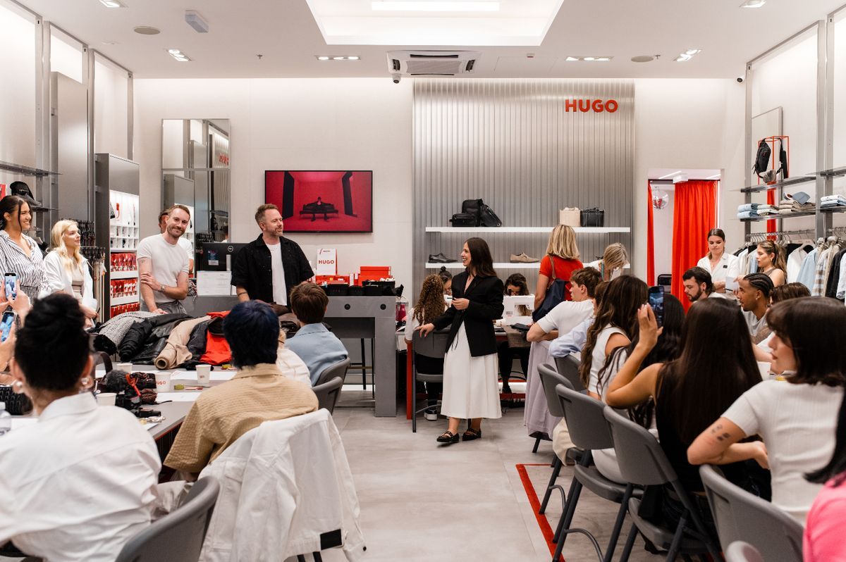 Następnego dnia po przylocie, zwieńczonym drinkami na 30. piętrze, czekała na nas wizyta w centrum handlowym Mall of Split. W sklepie HUGO między wieszakami z najnowszymi kolekcjami rozłożono stoły warsztatowe. Do stworzenia własnych projektów w stylu marki trzeba było zebrać team: dwóch projektantów z berlińskiego zespołu, grupę szwaczek i szwaczów, i nas – redakcje z połowy Europy. Materiały – od skóry ekologicznej, po satynę, bawełnę, tweed – to oryginalne tekstylia HUGO, te same, z których powstaje kolekcja jesień 2025.