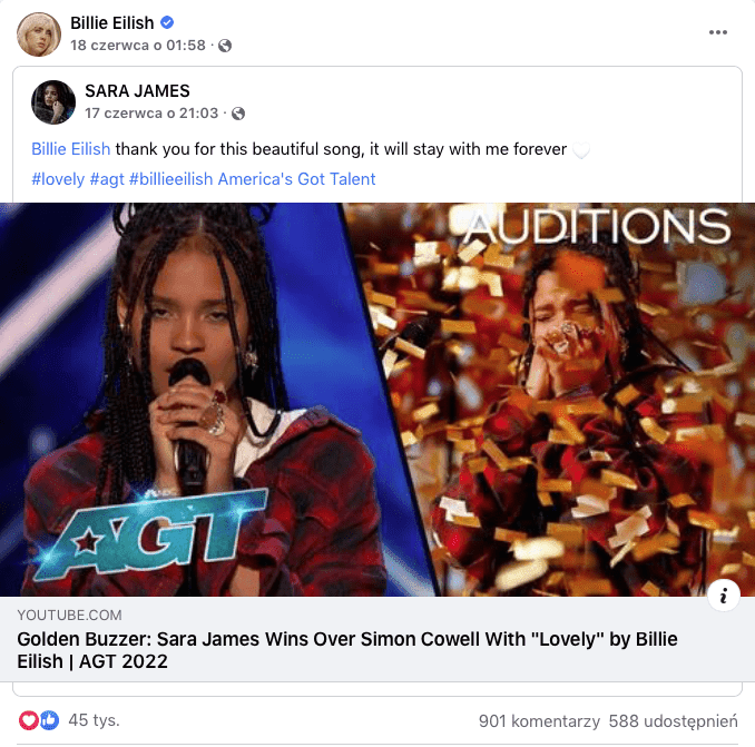 W zeszłym tygodniu wyemitowano odcinek „America's Got Talent" z udziałem Sary James. 14-letnia Polka zachwyciła Simona Cowella, twórcę zespołów One Direction i Fifth Harmony, który użył Złotego Przycisku. Sara wykonała utwór „lovely" Billie Eilish i khalida, a jej występ udostępniła sama Eilish.