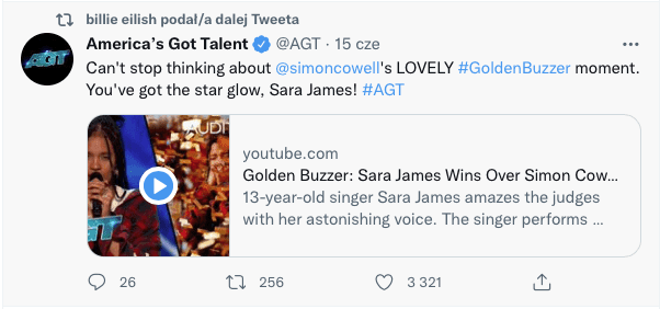 Artystka również podała dalej na Twitterze post „America's Got Talent" z występem Sary.