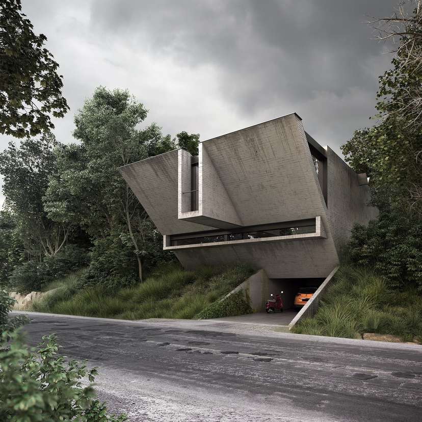 Architektura brutalistyczna zakłada w końcu, że najważniejsza jest przestrzeń, konstrukcja i funkcjonalność. I taki właśnie ma być ten budynek – głównie dzięki twardym i surowym kształtom, blokowatemu wyglądowi i ekspresji elementów strukturalnych. Ciemno-szary beton jest tutaj jedynym wykorzystanym materiałem wykończeniowym. Budynek umiejscowiony jest na lekko pochylonej działce, co architektowi udało się wykorzystać jako zaletę, ukrywając część parterową budynku, która obejmuje garaż wraz ze strefą wejściową, pomieszczenie gospodarcze, a także klatką schodową prowadzącą na inne, pozostałe piętra.