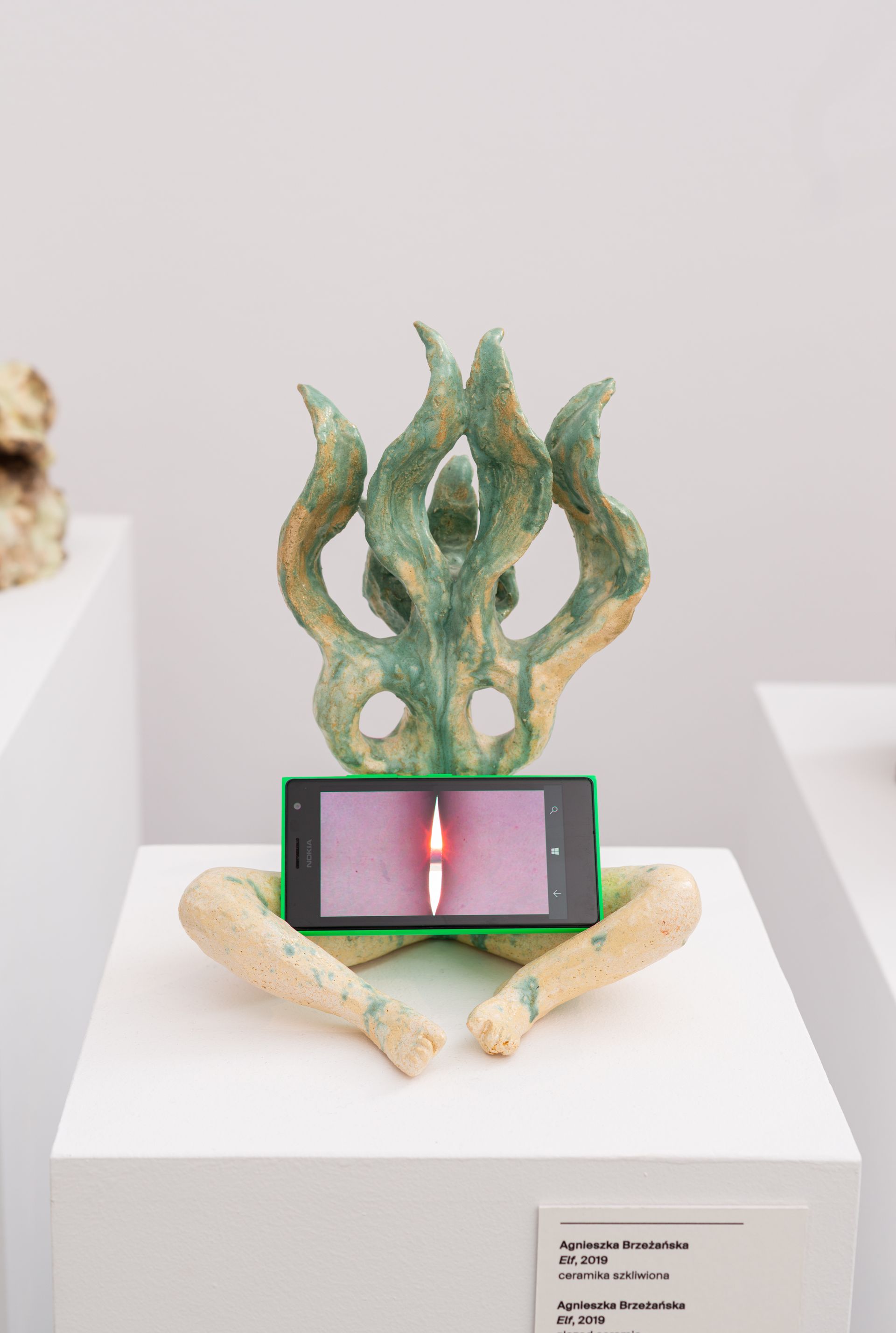 Elf, 2019, ceramika szkliwiona; Zachód słońca, 2019, wideo, fot. Szymon Rogiński