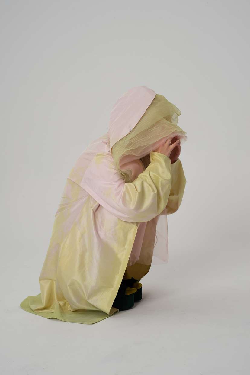 Monika Kaczyńska: Wybrane przeze mnie tkaniny to przede wszystkim wysokogatunkowe materiały, w przeważającej mierze naturalnego pochodzenia. Był to istotny czynnik ze względu na podatność na farbowanie. Przy doborze materiałów kierowałam się również ich różnorodnymi strukturami. Istotne były ich właściwości, które umożliwiły odtworzenie delikatnej faktury płatków kwiatu w połączeniu z przestrzennymi formami.