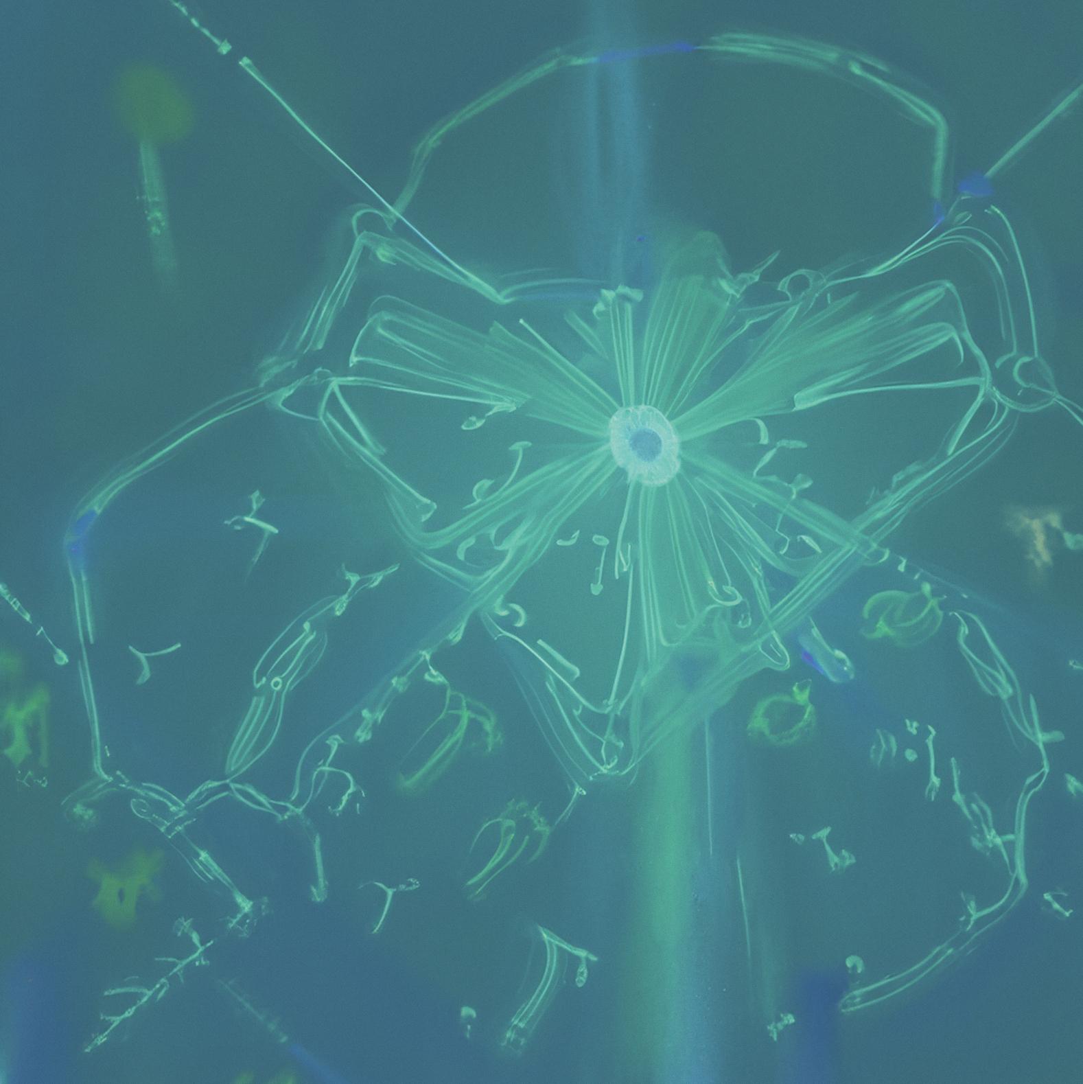 Wśród prezentowanych prac znajduje się realizacja powstała przy użyciu mikroskopu, której współautorem, obok Broni Zamachowskiej, gościnnie jest James Weiss — uznany twórca w tej dziedzinie. Obrazy mikroskopowe fragmentów roślin i środowiska wodnego stworzone przez Zamachowską i Weiss’a balansują na granicy abstrakcji i biologicznej precyzji, budując wizję świata widzianego z perspektywy mikroskopijnych struktur — kruchych, ulotnych, ale jednocześnie fundamentalnych dla życia.