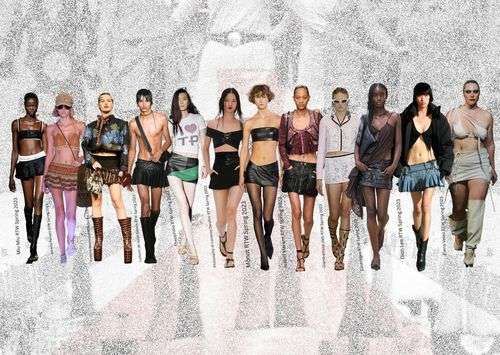 fot. kolaż Patrycja PyzaWiększość z nas doskonale pamięta głośną kolekcję Miu Miu z 2022 roku, nad którą stylistycznie czuwała Lotta Volkova. To właśnie ten pokaz przeniósł nas wprost do estetyki wczesnych lat 2000 i zapoczątkował powrót trendu mini. Nie tylko w formie spódnic, ale również szortów, obcisłych sylwetek, odsłoniętych brzuchów i crop topów.