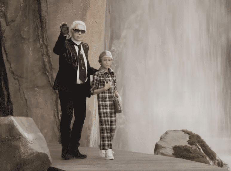 Karl Lagerfeld w swoim zwyczajowym stroju po zakończeniu pokazu Chanel SS18