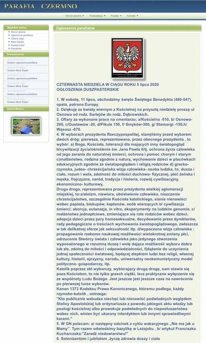 Na stronie Parafii Nawiedzenia Najświętszej Maryi Panny i św. Mikołaja w Czermnie w dziale ogłoszeń pojawił się obszerny wpis dotyczący wyborów. Głosowanie w wyborach przedstawiono jako wybór jednej z dróg. Prezydent Andrzej Duda reprezentuje "Boga i Kościół", a Rafał Trzaskowski "ateizm, niewiarę, niszczenie chrześcijaństwa". Jakby tego było mało 5 lipca ksiądz Jerzy Rozmysłowski otwarcie zachęcał podczas mszy do głosowania na prezydenta Dudę.