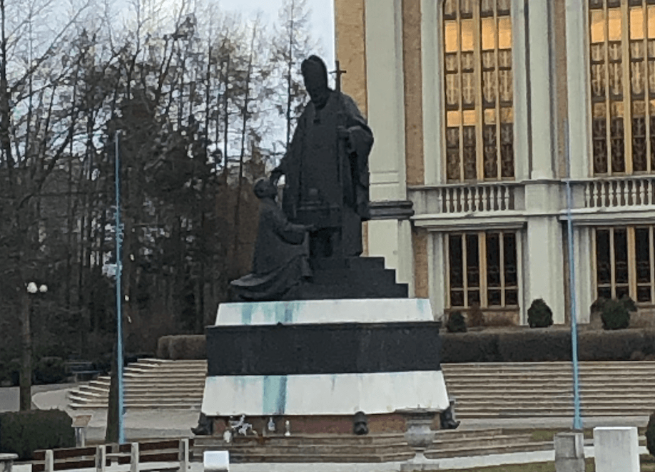 Symbolem tego jest przykrycie słynnego pomnika przed największym kościołem w Polsce - Bazyliką Najświętszej Maryi Panny Licheńskiej. Okryta właśnie białą płachtą przez władze Sanktuarium rzeźba ukazuje oskarżonego w filmie o czyny pedofilskie ks. Eugeniusza M., inicjatora budowy Bazyliki i jej kustosza, klęczącego przed Janem Pawłem II z makietą budynku.