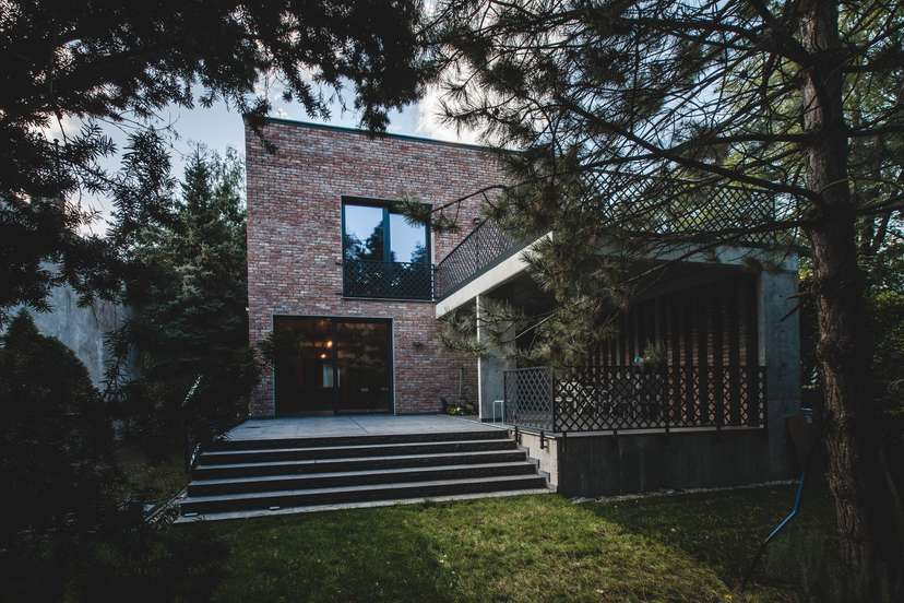 Dom charakteryzuję się surowością i naturalnością wnętrza, które wypełnione zostało ceglanymi i betonowymi elementami. Wielki betonowy taras wychodzący na ogród to prawdziwa oaza spokoju. Ograna dużymi ceglanymi i betonowymi słupami, tworzącymi ażurową układankę, oddziela domowników od otoczenia.