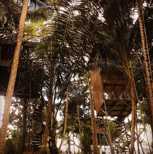 Domki wręcz wtapiają się w otaczające je środowisko. Aby się do nich dostać, trzeba wspiąć się po kręconych, metalowych schodach. W środku znajdziemy sypialnię z łazienką, balkon, a na najwyższym piętrze dodatkowo taras na dachu. Duże, przestronne okna sprawiają natomiast, że choć goście przebywają w pomieszczeniu, mają poczucie, że znajdują się w samym sercu dżungli.
