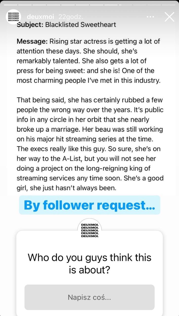 Autorka Deuxmoi udziela wywiadów i prowadzi swój własny podcast, ale nie zamierza rozmawiać na temat swojego życia prywatnego. I bardzo dobrze, bo dzięki temu Deuxmoi jest jeszcze ciekawsze! – Lubię, gdy moje prywatne życie jest prywatne. Jeśli mam być szczera, to nie jestem szczególnie interesująca. Super interesujące jest to, co dzieje się z tym kontem, ale ja taka nie jestem. Ja tylko nim zarządzam – powiedziała w rozmowie z amerykańskim Elle.
