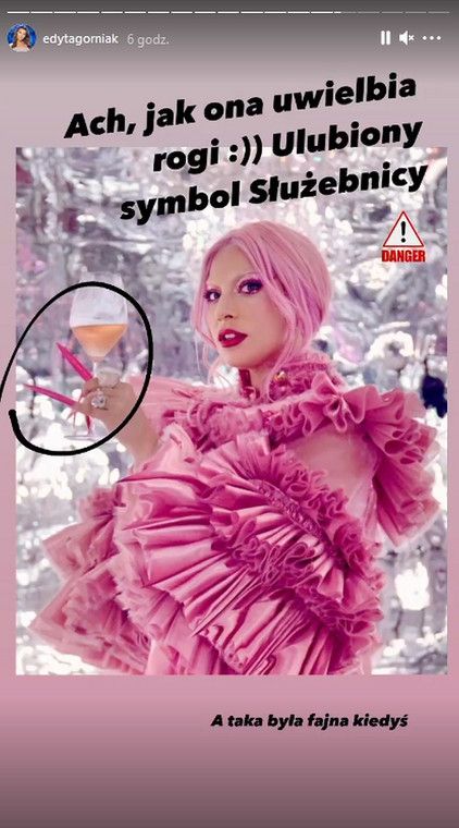 Coraz częściej mówi się o Edycie Górniak nie ze względu na jej dokonania muzycznia, ale kontrowersyjne przekonania na temat pandemii czy życia na innych planetach. Tym razem piosenkarka postanowiła poruszyć temat Lady Gagi. W niedzielę Górniak udostępniła na InstaStories kadr z kampanii stworzonej dla marki Dom Pérignon oraz nazwała Lady Gagę „służebnicą" Szatana. Kiedy jeden z obserwatorów odezwał się do piosenkarki w wiadomości prywatnej, usłyszał, że Gaga... pije krew niemowlat.