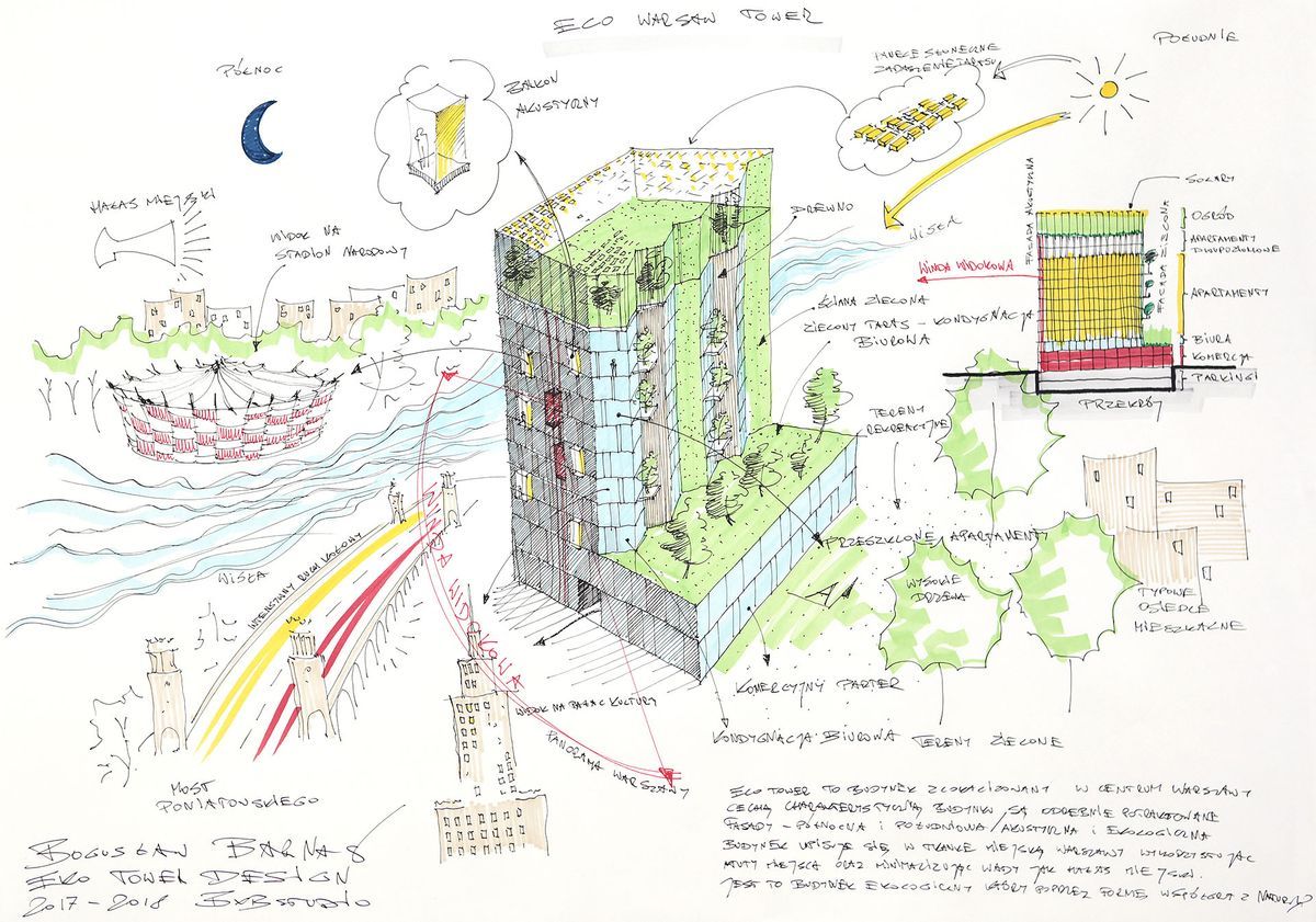Warsaw Eco Tower na dolnych kondygnacjach będzie mieścił w sobie powierzchnie biurowe i komercyjne, natomiast wyżej ulokowane zostały przestrzenie mieszkalne. Celem projektu była redukcja zapotrzebowania na energię, stworzenie architektury funkcjonalnej i jednocześnie pięknej. Na dachu został umieszczony dwupoziomowy ogród dostępny dla mieszkańców najwyższych apartamentów. Ogród zadaszony został ażurową strukturą pozyskującą energie słoneczną, która jednocześnie filtruje wpadające do ogrodu światło.