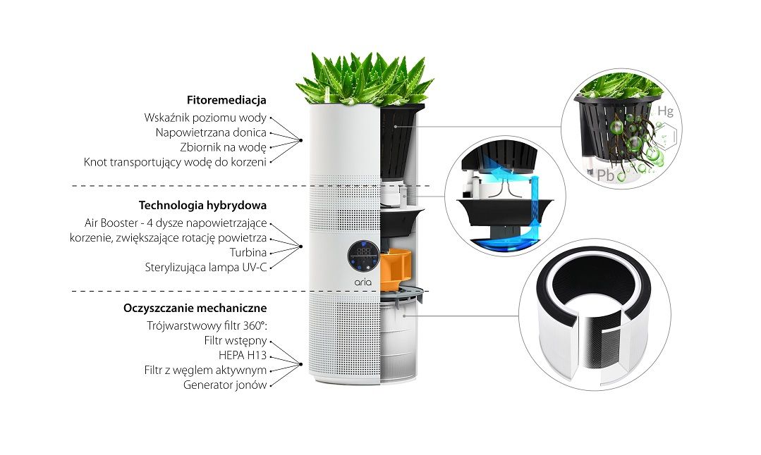 Jak pisaliśmy, same rośliny mają właściwości oczyszczające i mogą mieć pozytywny wpływ na alergików czy astmatyków. Firma Mateko, tworząc Arię, poszła o krok dalej i połączyła właściwości roślin ze znanym mechanizmem oczyszczania. Klasyczna technologia oczyszczacza powietrza ARIA wykorzystuje bakteriobójcze światło UV-C, filtr z węglem aktywnym HEPA oraz generator jonów, których skuteczność w usuwaniu zanieczyszczeń powietrza została udowodniona. Aria ulepsza ją jeszcze bardziej i zwiększa CADR (współczynnik dostarczania czystego powietrza) dzięki zastosowaniu Air Boostera Mateko, który wykorzystuje turbinę, aby przyspieszyć naturalny ruch powietrza. ARIA wciąga powietrze z dołu, prowadząc je przez wiele filtrów, a także komorę UV-C, by na koniec doprowadzić je do rośliny, gdzie w jej systemie korzeniowym zachodzi fitoremediacja niszcząca pozostałe toksyny i zanieczyszczenia, które mogą czaić się w powietrzu.