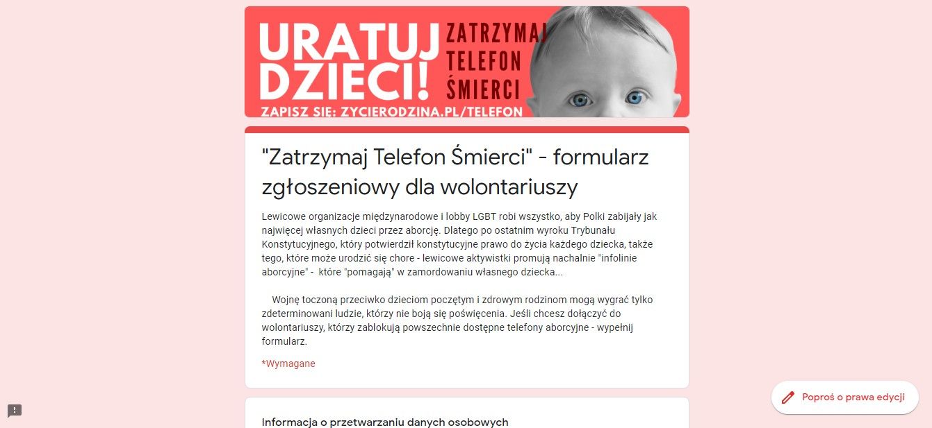 Równocześnie na stronie Fundacji Życie i Rodzina ruszył nabór na wolontariuszy, którzy... pomogą w blokowaniu infolinii „Aborcji bez granic".