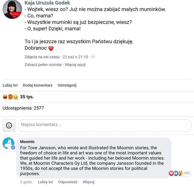 Od czwartku trwają protesty przeciwko wyrokowi Trybunału Konstytucyjnego ws. aborcji z powodu ciężkiej wady płodu. Choć decyzja Trybunału Konstytucyjnego wkurzyła tysiące Polek, ucieszyła Kaję Godek. Gdy ogłoszono wyrok, współpracownicy Godek zaczęli... podrzucać ją w powietrze. Tego samego dnia prawicowa aktywistka podzieliła się z obserwatorami rozmową, w której poinformowała swojego syna, że „już nie można zabijać małych muminków". Jej post szybko stał się viralem i wkrótce pojawił się pod nim komentarz oficjalnego fanpejdża Muminków. Przedstawiciele, założonej przez twórczynię kultowych Muminków, firmy Moomin Characters Oy Ltd nie byli zadowoleni z posta Godek.