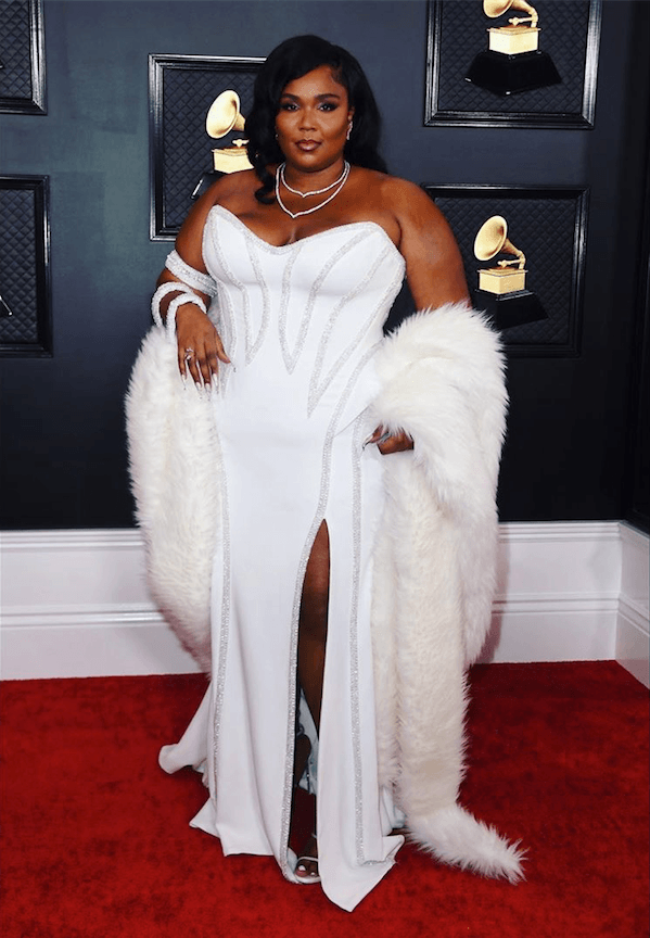 Kilka odsłon bieli również zasługuje na uwagę. Stawkę otwiera Dua Lipa w projekcie Alexandra Wanga. Top na ramiączkach połączony z prostą, satynową spódnicą przywołuje na myśl lata 90. w ich minimalistycznym wydaniu. Kilka dekad dalej cofnęła się Lizzo, która czerpała pomysły ze złotej ery Hollywood. Futrzana etola oraz srebrne hafty na sukience wystarczyły, by wykreować wizerunek godny gwiazdy kina.