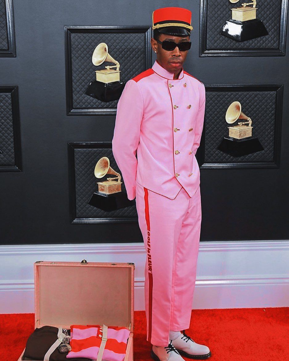 Na szczęście to niejedyny muzyk, który tego wieczoru postawił na róż. Warto zwrócić uwagę na Taylera, The Creatora. Zwycięzca w kategorii najlepszego albumu rapowego przyszedł na galę w pastelowo-różowej liberii z pasującą do niej walizką. Na pierwszy rzut oka można było go pomylić z postacią z filmu Grand Budapest Hotel (2014).