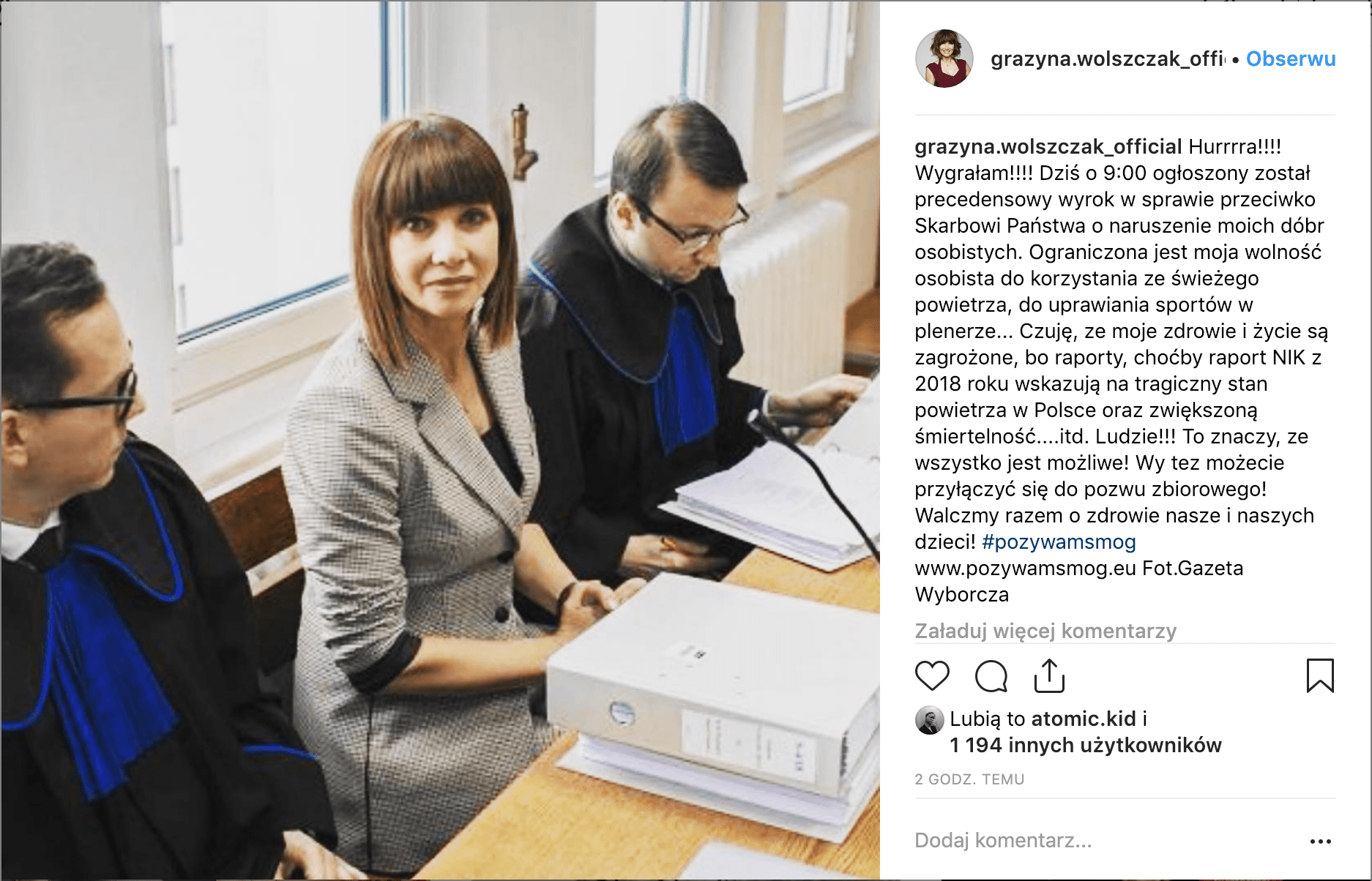 - Ludzie!!! To znaczy, ze wszystko jest możliwe! Wy tez możecie przyłączyć się do pozwu zbiorowego! Walczmy razem o zdrowie nasze i naszych dzieci!#pozywamsmog- pisze aktorka.