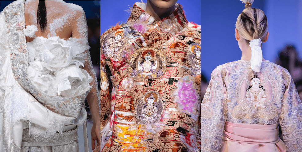Himalaje mogą być jednymi z najmłodszych pasm górskich, ale dla zwykłych śmiertelników ich wiek i tak jest imponujący. By uwydatnić ten właśnie aspekt, Pei użyła wiekowych pasów obi, które pocięła i zszyła na nowo, pokazując ich lewą stronę, dzięki czemu publiczność mogła zauważyć jak zniuansowaną strukturę w sobie kryją. Pojawiły się też thanki – te kolorowe, malowane lub haftowane zwoje o tematyce religijnej zawiesza się w klasztorach buddyjskich i prywatnych domach, a czasem też uroczyście nosi w procesjach. U Pei zostały one wykonane przy pomocy bogatego złotego haftu na zapierających dech w piersiach brokatach. Nie ma się czemu dziwić: każdy, kto śledzi poczynania Chinki wie, że ma ona słabość do luksusowych, obfitych tkanin.