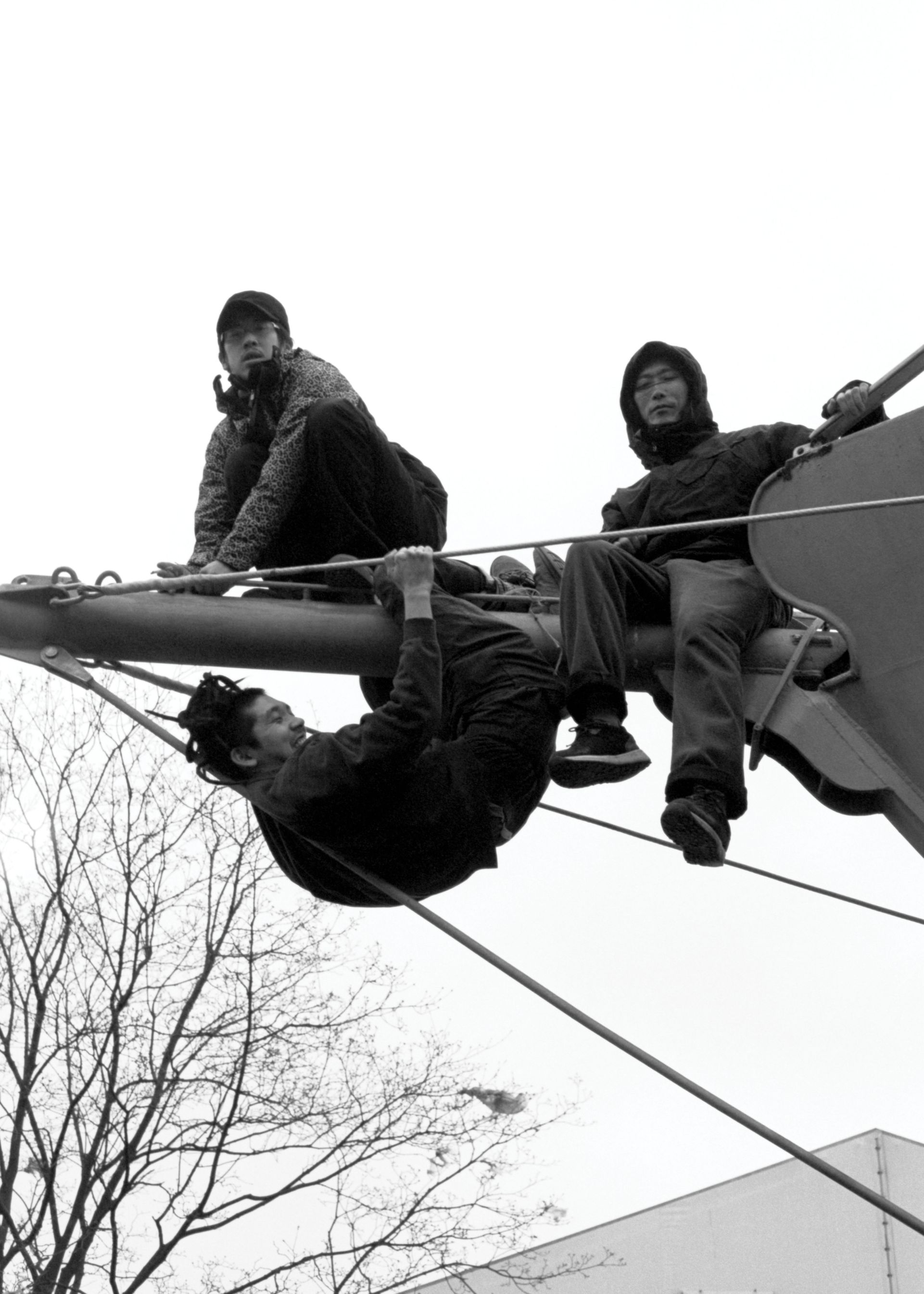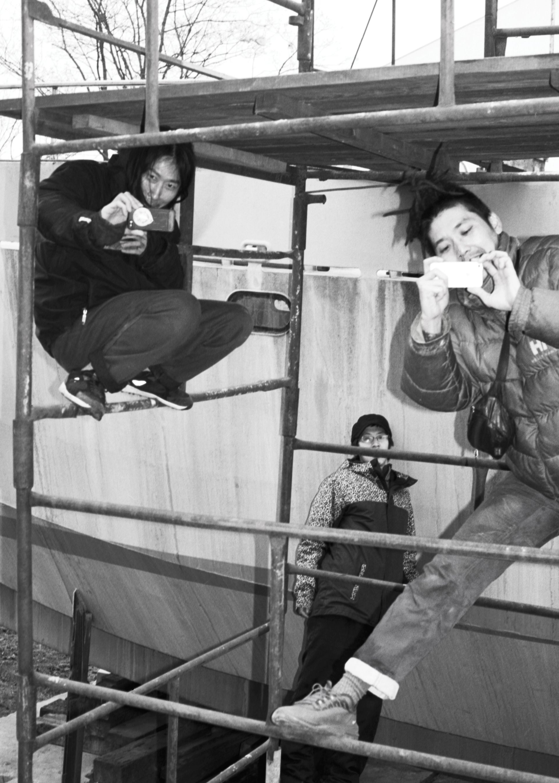 „Poznaliśmy się na Kyoto City University of Arts, gdzie ja studiowałem projektowanie tkanin, a Fuminori i Yuu architekturę. Po szkole każdy z nas wrócił w swoje rodzinne strony. Któregoś dnia z okna mojego domu zobaczyłem, że góra, która była częścią krajobrazu, zniknęła. Pojawiło się za to ogrodzenie i informacja o osiedlu, które tam powstanie. To był 2009 rok. Na teren budowy weszliśmy w niedzielę, bo tylko w ten dzień nie odbywały się tam żadne prace. Pierwsze, co ujrzeliśmy, to była ogromna góra drzew, które ścięto. Od tamtej pory przez kolejne dziesięć lat przychodziliśmy tam co tydzień i za każdym razem krajobraz był zmieniony. Wtedy powstał nasz kolektyw, ale nie myśleliśmy o tym, że robimy projekt artystyczny, który potem trafi na wystawę. To była wspólna zabawa, przy okazji której kręciliśmy filmy i robiliśmy zdjęcia” mówił Itaru Kato w wywiadzie z Agnieszką Sural.