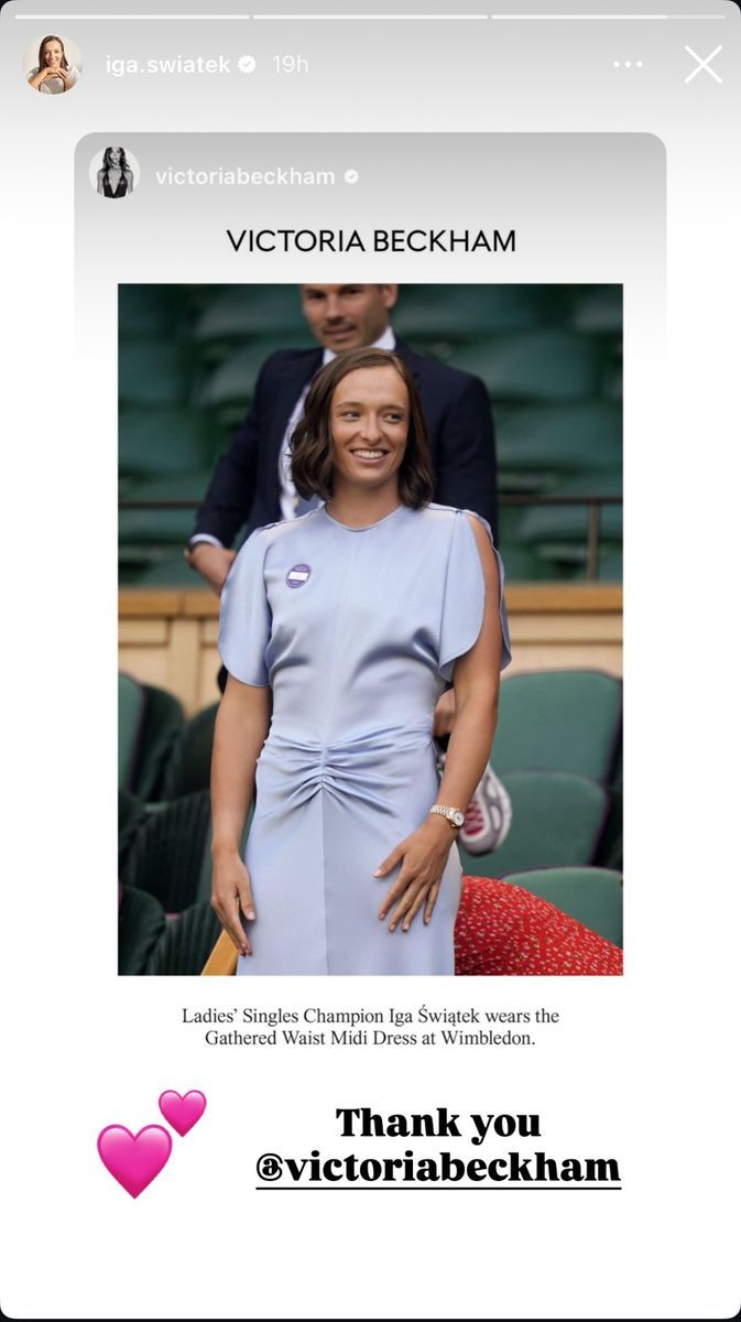 Zgodnie z tradycją turnieju, następnego dnia po wygranym finale, zwycięzca bierze udział w krótkiej, oficjalnej sesji zdjęciowej. Iga Świątek na tą okazję wybrała flagowy projekt Victorii Beckham - zebraną w talii jedwabną sukienkę w kolorze królewskiego błękitu. Była członkini zespołu Spice Girls to ważna postać nie tylko mody, ale i kultury, zatem wybór właśnie jej kreacji na oficjalną sesję Wimbledonu zdaje się mieć symboliczne znaczenie. Beckham udostępniła zdjęcie polskiej tenisistki na swoim Instagramie.