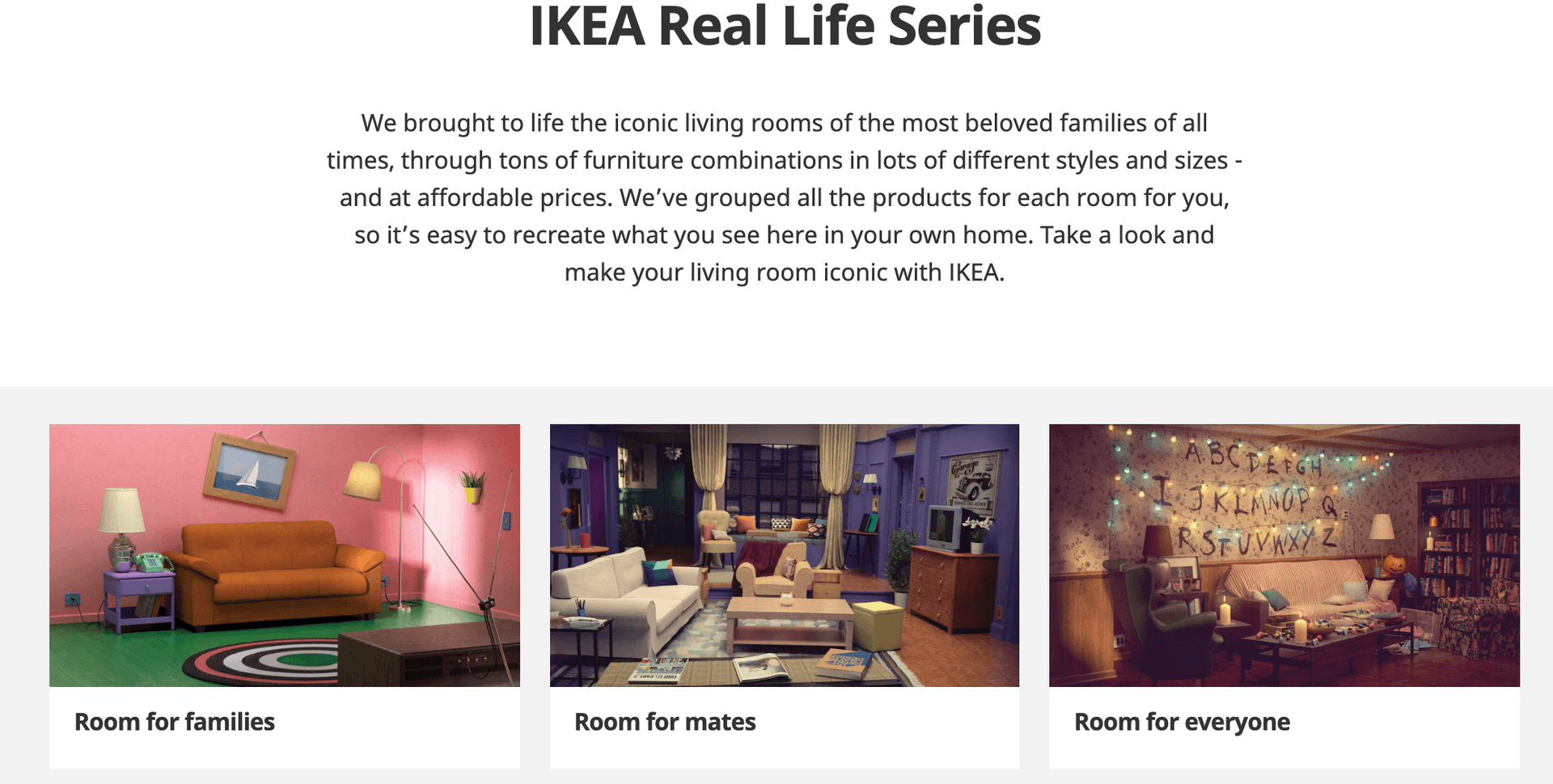 Ikea postanowiła spełnić marzenie wielu fanów kultowych seriali. Szwedzka marka odtworzyła pokoje z seriali „Przyjaciele”, „Stranger Things”, oraz „Simpsonowie”, przy użyciu produktów dostępnych w sklepie w Zjednoczonych Emiratach Arabskich.