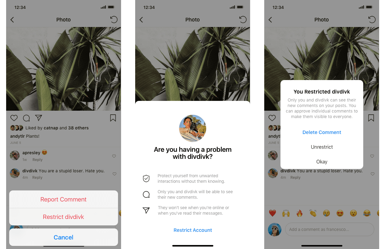 „Restrict” pozwala na zastrzeżenie komentarzy umieszczonych przez osobę, która nas obraża, bez ich bezpośredniego usunięcia. Komentarze będą widoczne tylko dla osoby, która je zamieściła, ale nie będą widoczne na profilu ofiary. Funkcja pozwoli także użytkownikowi na moderację komentarzy umieszczonych pod postem, który będzie sam mógł zdecydować, czy chce, aby były one widoczne. Internetowy troll nie zobaczy też, czy wyświetlamy od niego wiadomości, ani czy jesteśmy aktywni.