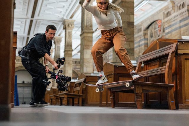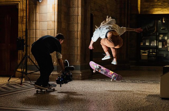 Jednym z kluczowych ujęć nagranych w muzeum był moment, w którym Leticia Bufoni wykonała kick-flip nad szkieletem Velociraptora. Trik wyglądał niesamowicie, a do jego zarejestrowania wykorzystano specjalny system składający się z 64 lustrzanek cyfrowych Canon. Po zachodzie słońca do zdjęć użyto aparatuCanon EOS R5, którego wysoka jakość w warunkach słabego oświetlenia pozwoliła na uchwycenie niezwykłych ujęć. Dyrektorowi kreatywnemu, Tysonowi Bentonowi, zależało na uzyskaniu efektu bullet-time, wykorzystywanego w grach komputerowych i filmach. Polega on na spowolnieniu lub zatrzymaniu czasu w scenie. Ten zabieg możecie kojarzyć z „Matrixa”. Benton zdradził, że inspirował się fotografią sportową oraz estetyką skateboardową.