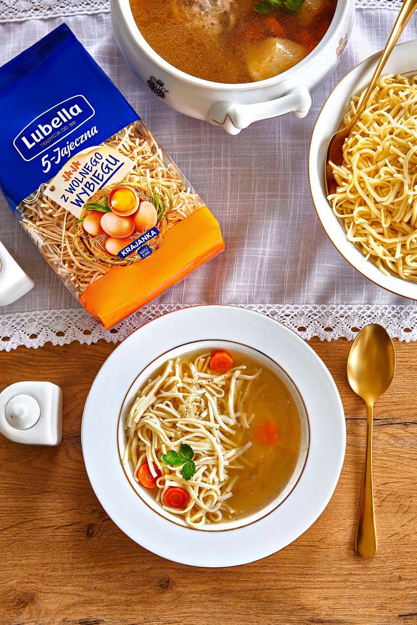 Kto nie uwielbia rosołu? To nieodłączny element obiadu u rodziców czy dziadków, a także powierzchnia odwiecznej walki o to, co lepsze: sam bulion czy z dodatkiem makaronu? Odpowiedź na to pytanie staje się zdecydowanie bardziej klarowna, odkąd zgodnie z trendami żywieniowymi, a zatem większą troską o środowisko i planetę, Lubella wprowadziła znaczącą zmianę do receptury swoich makaronów. Teraz Lubellę 4- i 5-jajeczną dostaniemy wyłącznie z wykorzystaniem jaj od kur z wolnego wybiegu. Dzięki tej zmianie naturalny smak i domowość makaronów Lubella Jajeczna będą doskonałym uzupełnieniem tradycyjnego rosołu.