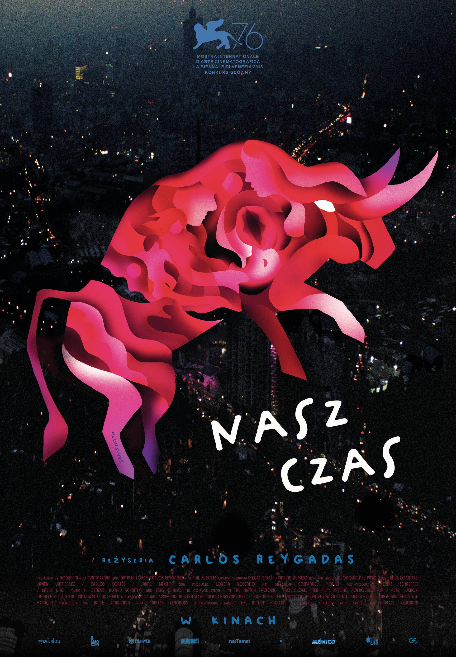 Na pierwszy rzut oka na plakacie „Naszego czasu" widnieje różowy byk na ciemnym tle. Dopiero po dłuższej chwili zauważamy, że byk jest zbudowany z wielu elementów przypominających płatki kwiatów, a w jego sercu widać dwie postacie. Ciemne tło z punktowymi plamami światła to z kolei miasto Meksyk nocą.