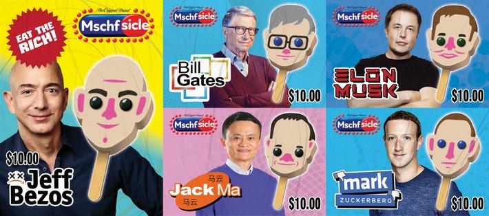 Limitowana edycja lodów z podobiznami największych bogaczy na świecie jest do zakupienia w przejeżdżających przez ulice Los Angeles i Nowego Jorku ciężarówkach. Cała akcja rozpoczęła się dzisiaj, czyli 11 lipca i ma potrwać do 13 lipca. Ciężarówek nie da się przegapić, bo już z daleka widać namalowane na nich znajome twarze bogatych mężczyzn. Pomysł, mimo że zabawny to jednak mało przystępny cenowo, ponieważ za jedną podobiznę na patyku należy zapłacić 10 dolarów, czyli prawie 50 złotych. Klienci mają za to do wyboru 5 podobizn, gdzie każdego miliardera reprezentuje inny smak. W pakiecie przewidziane jest również kilka sekund na zrobienie sobie zdjęcia z żartobliwą podobizną zanim lód się roztopi.