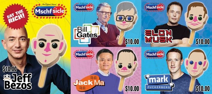 Twórcy dopracowali każdy szczegół akcji, przez odpowiedni design ciężarówki, która rozwozi lody, po uwzględnienie wszystkich charakterystycznych cech wyglądu miliarderów. Zadbali również o same nazwy lodów. Wszystkie nazwy mają wspólny mianownik, czyli synonim który ma oznaczać "łakome podjadanie" i zaczyna się tą samą literą co nazwisko danego miliardera, albo rymuje się z konkretnym nazwiskiem. W ofercie więc znaleźć można: