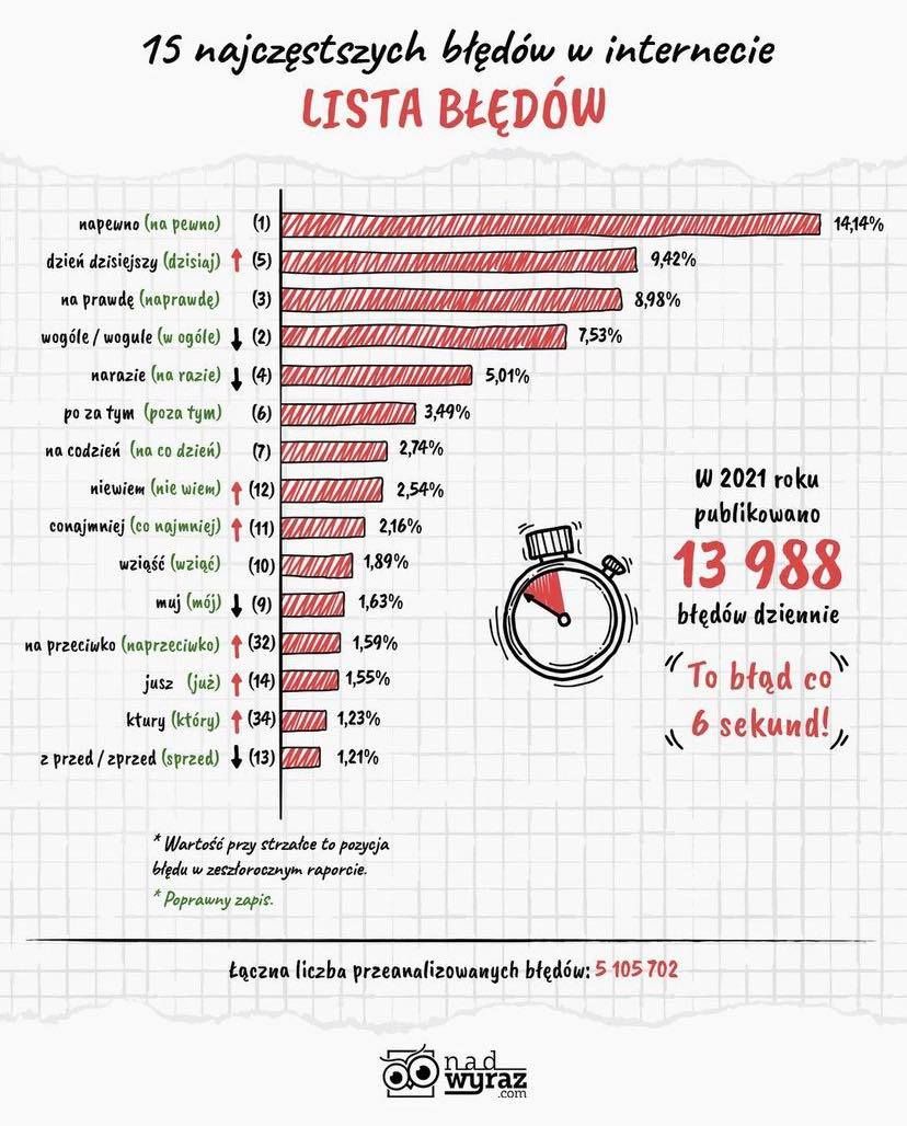 Wśród 15 najczęstszych błędów w internecie znalazły się: „napewno”, „dzień dzisiejszy”, „na prawdę”, „wogóle/wogule”, „narazie”, „po za tym/pozatym”, „na codzień/nacodzień”, „niewiem”, „conajmniej”, „wziąść”, „muj”, „na przeciwko/na przeciwo”, „jusz”, „ktury”, „z przed/zprzed”.