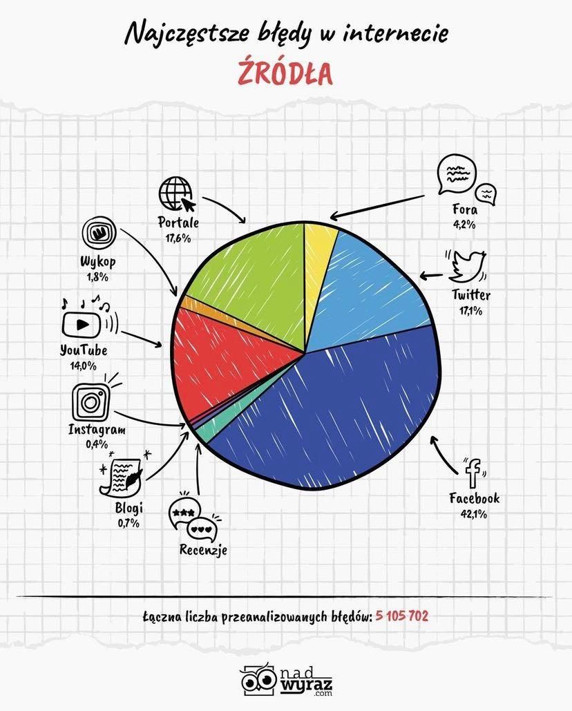 Facebook z roku na rok stanowi coraz większe źródło niepoprawnych form. W porównaniu z rokiem 2020 liczba błędów znalezionych na tym portalu wzrosła aż o 10,6%.