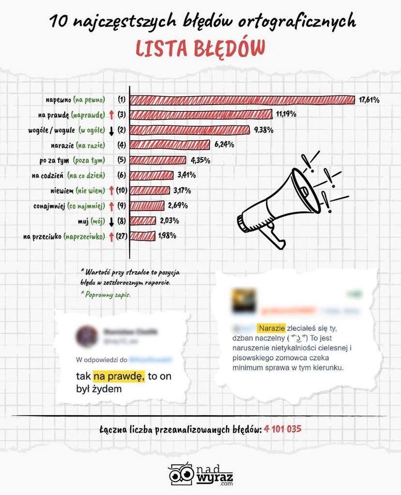 „Raport 100 najczęstszych błędów językowych w internecie w 2021 roku” to już czwarta edycja raportu realizowanego przez Nadwyraz.com we współpracy z portalem Polszczyzna.pl i partnerem technologicznym SentiOne.