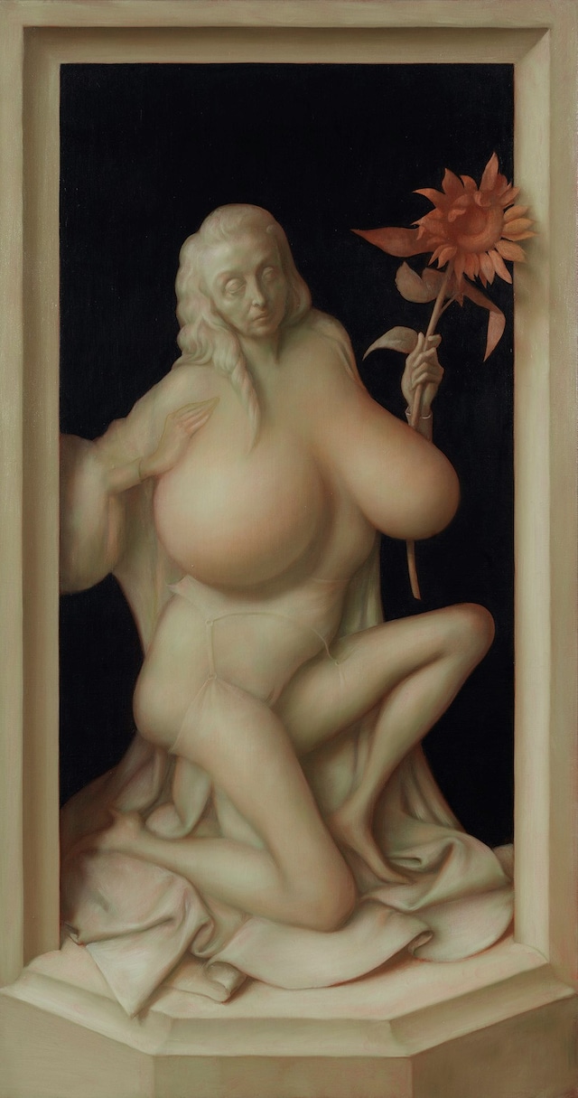 Ciało kobiece wykręcone w niemożliwą pozę, nabrzmiałe piersi, dłonie i stopy nieproporcjonalnie drobne. Twarz nieobecna. Wszystko malowane tak, jakby to był posąg. Alabaster, nie ciało. Grobowiec, nie peep show.