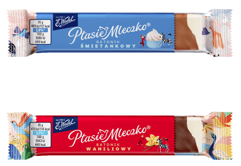 Ptasie Mleczko® batonik to nowa wersja kultowego produktu od E.Wedel. Nowy format kultowego przysmaku stanowi idealne rozwiązanie dla konsumentów ceniących smakołyki w mniejszym formacie. Niebiański batonik zapewni chwilę przyjemności podczas codziennych zajęć, podróży lub spotkań z bliskimi, a dostępny jest w dwóch wariantach smakowych: waniliowym, oblanym wedlowską czekoladą deserową, i śmietankowym – w czekoladzie mlecznej.
