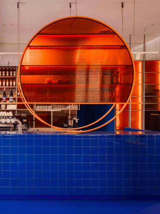W środku uwagę zwracają przede wszystkim kobaltowa posadzka oraz opływowy bar. Pomarańczowy okrąg nawiązuje do barw zachodzącego słońca. Granat także nie jest tutaj przypadkowy – symbolizuje rzekę, otaczającą klubopiekarnię, która mieści się na wyspie. W lokalu znajduje się również otwarta kuchnia, umożliwiającą obserwację procesu wypieku.